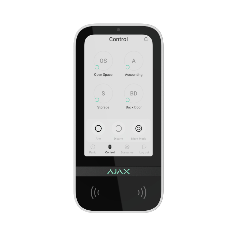 Wireless touchscreen keypad is used to arm and disarm an Ajax security system. It is mounted indoors, typically near the entrance, to provide fast and intuitive system control with a modern touch interface.
