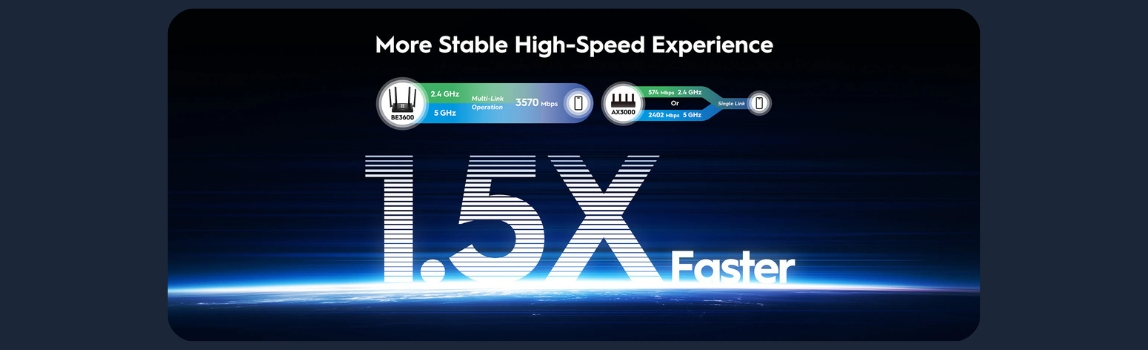 A dual-band WiFi 7 router with an aggregate of 3.6 Gbps speed and five Gigabit ports, catering to gaming and entertainment scenarios.