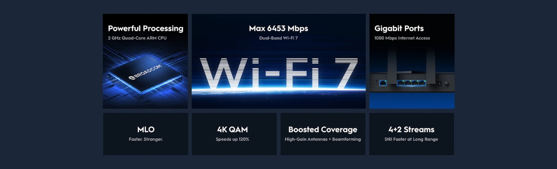 A dual-band WiFi 7 router with an aggregate of 6.5 Gbps speed, and five Gigabit ports, catering to super-fast internet access, gaming, and entertainment scenarios.