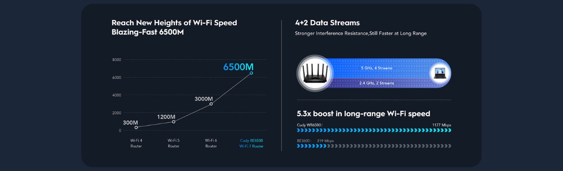Featuring smarter Multi-RU and Puncturing spectrum reuse technology, WR6500 significantly boosts interference resistance, optimizes spectrum usage, and ensures lower latency for gaming, calls, and web browsing across multiple devices