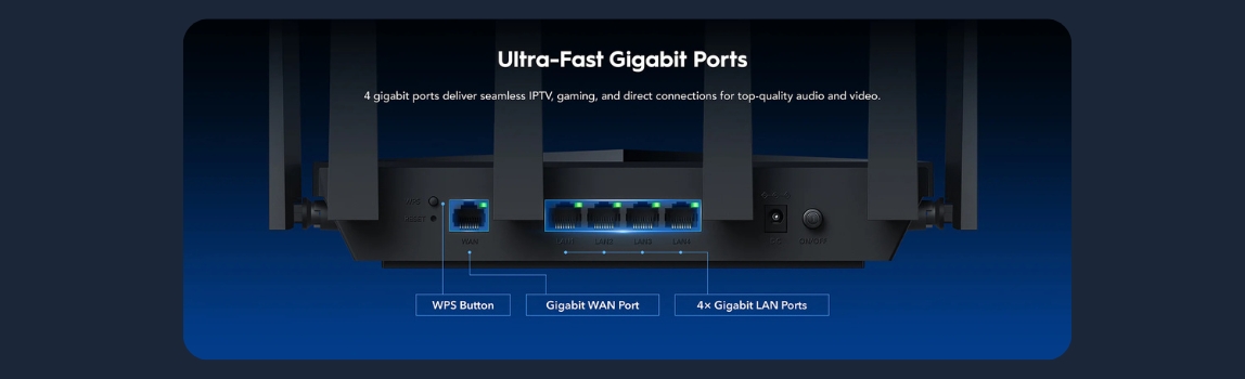 The high-gain antennas with Beamforming technology offer stronger, more focused Wi-Fi signals towards client devices, delivering faster speeds and greater stability throughout your home or office.