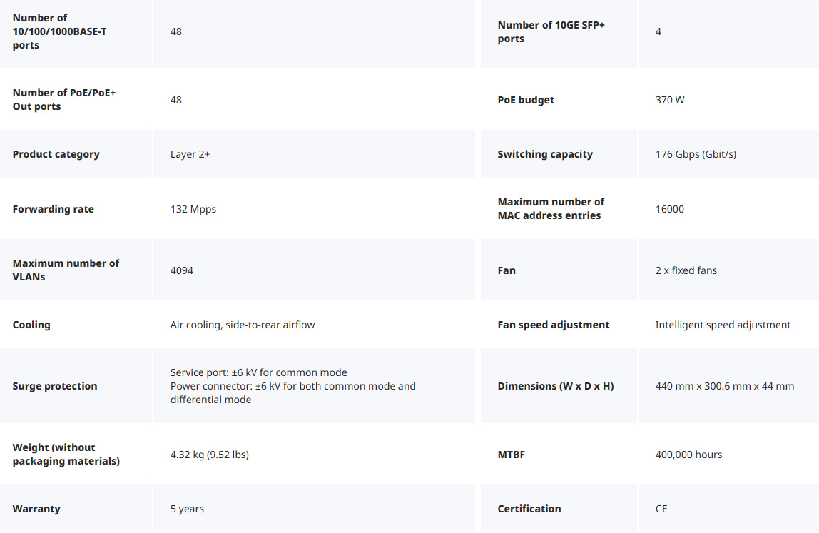 10/100/1000M Base-T ports | 48 x 10/100/1000Base-T PoE+ ports, 4 SFP uplink |